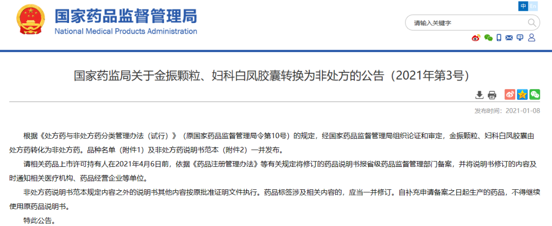 關(guān)于金振顆粒、婦科白鳳膠囊轉(zhuǎn)換為非處方的公告(2021年第3號(hào))