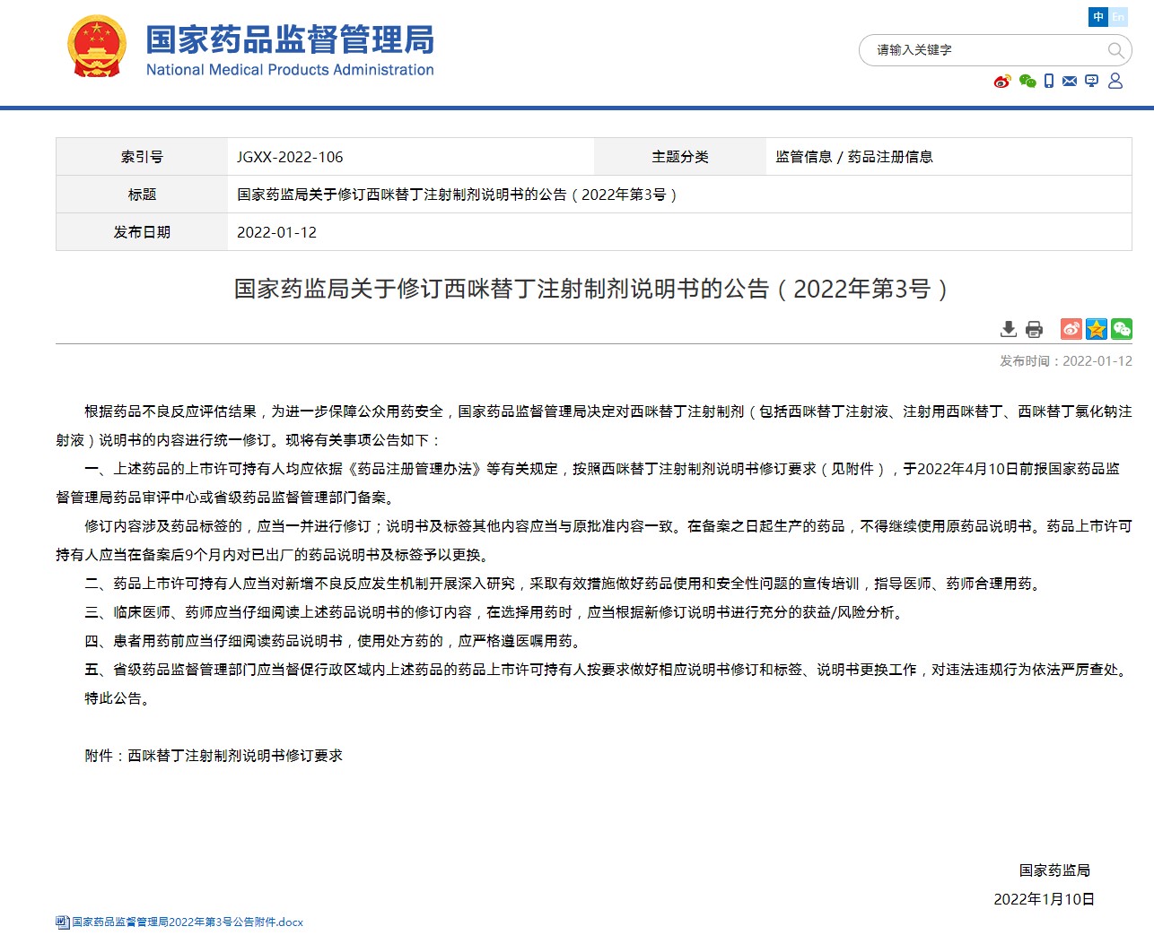 國家藥監(jiān)局關(guān)于修訂西咪替丁注射制劑說明書的公告