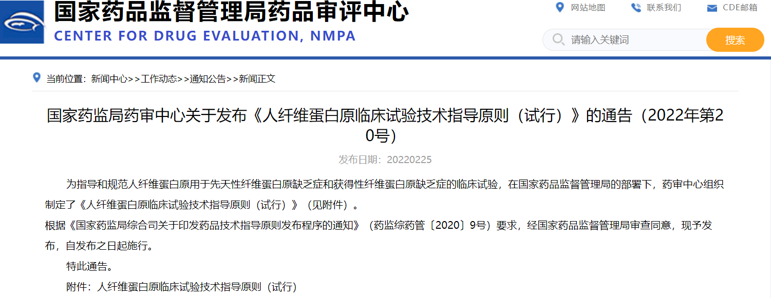 國家藥監(jiān)局藥審中心關(guān)于發(fā)布《人纖維蛋白原臨床試驗(yàn)技術(shù)指導(dǎo)原則(試行)》的通告(2022年第20號(hào))