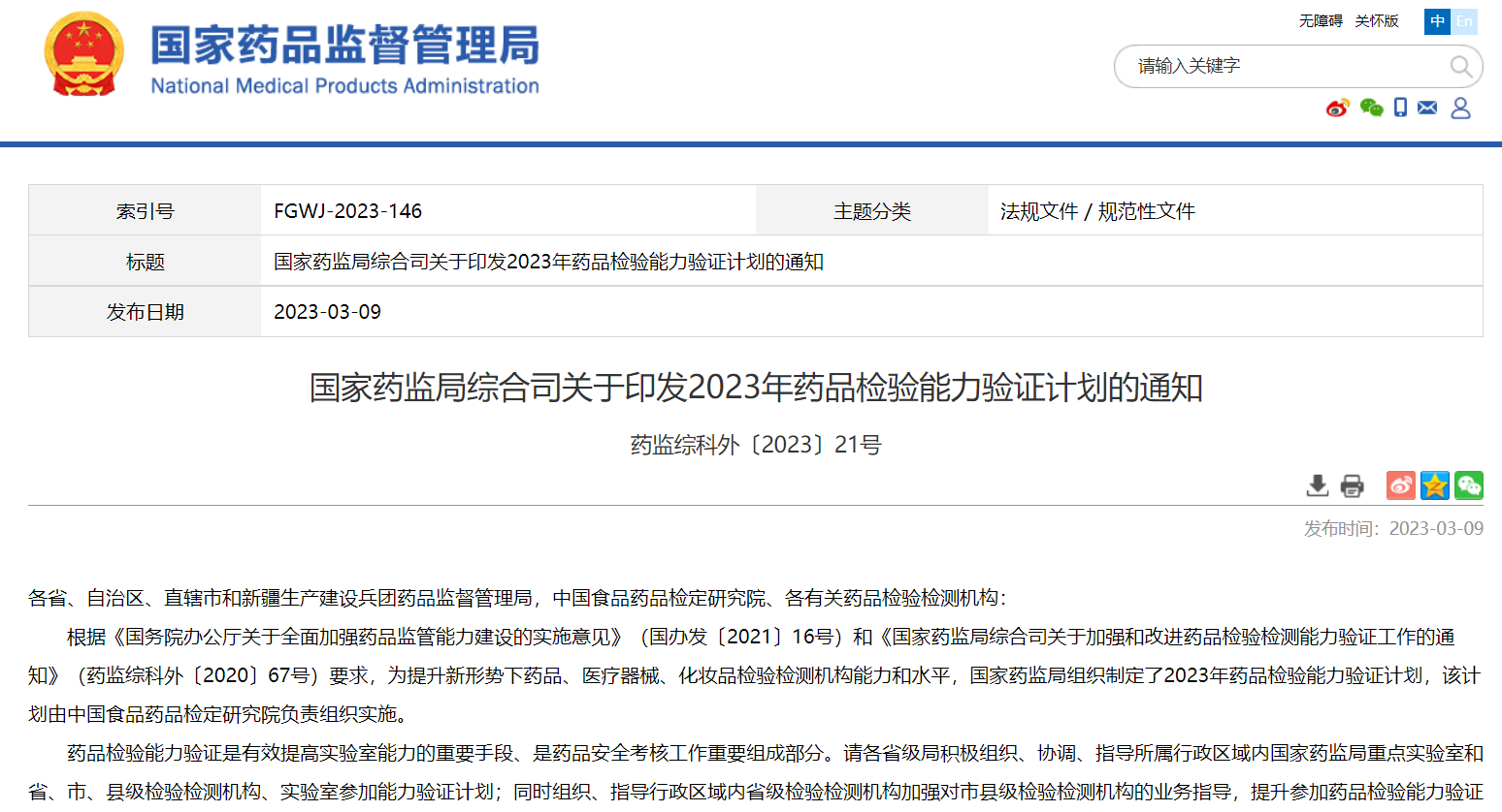 國家藥監(jiān)局綜合司關(guān)于印發(fā)2023年藥品檢驗(yàn)?zāi)芰︱?yàn)證計(jì)劃的通知